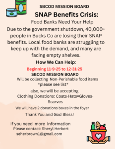 If you would like to bless others during this holiday, we are asking that you give a monetary donation of $25.00 either, online to Thanksgiving Meals, in-person cash or check made out and mailed to Second Baptist Church of Doylestown (memo – Thanksgiving Meals) by Sunday, Nov 16th.